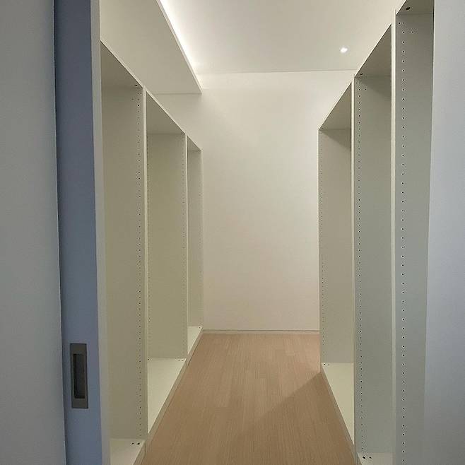 헤드 부분 왼쪽으로 문이 하나 있는데 그 문을 열면 보이는 드레스룸입니다. 저는 옷이 많은 편이 아니라 부부의 사계절 옷이 저 안에 다 들어갑니다. 비용 절감을 위해 이케아 팍스장을 직접 조립하였어요. 너무 근사하게 잘 짜와서 양쪽 어깨에 칭찬을 해줍니다.