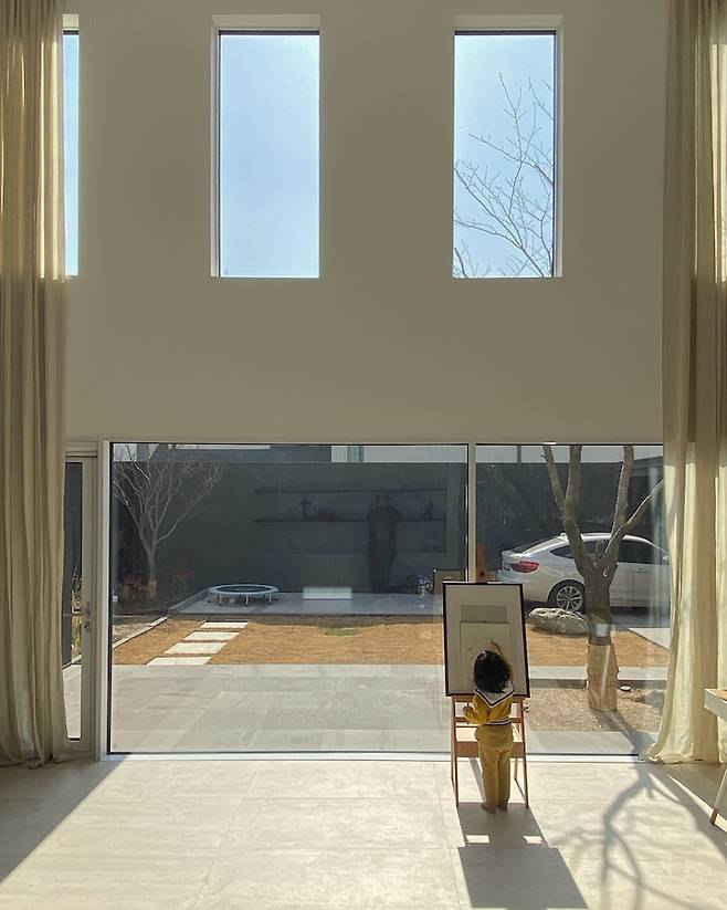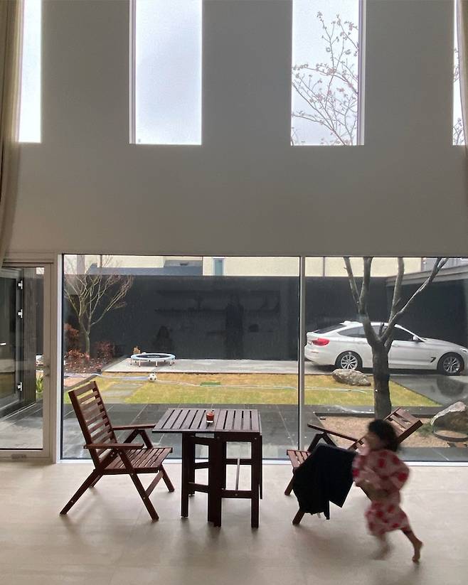 현관의 픽스창이 많이 커서 마당 전체가 시원하게 보여요. 아침에 해뜰 때 동쪽에서 해가 들어 옵니다.