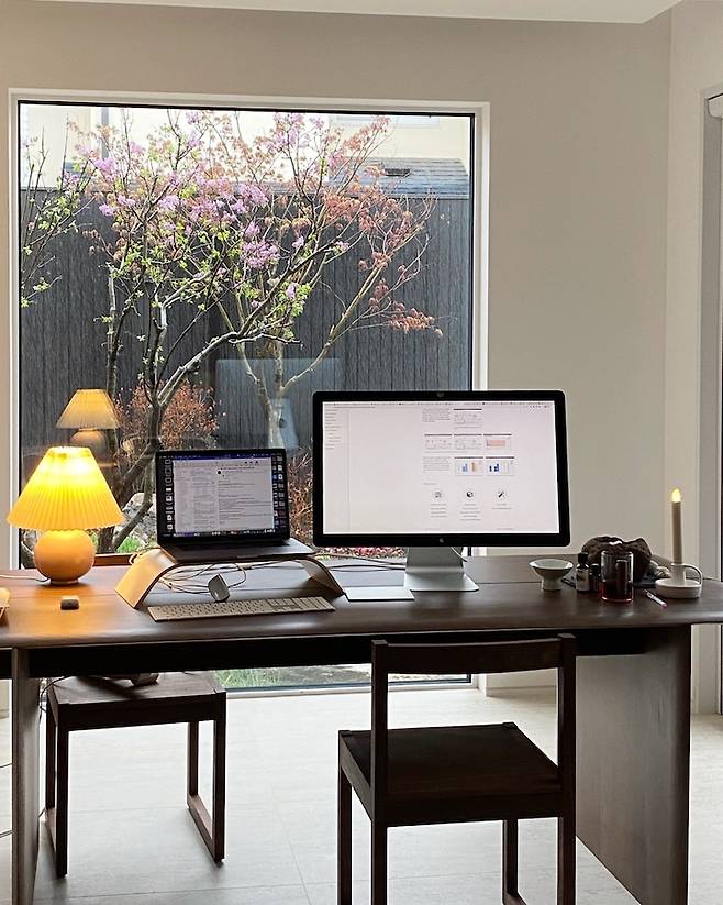 재택근무를 하기 때문에 홈오피스 공간을 여기저기 유목민처럼 돌아다니다 최근에 정착한 곳이 다이닝룸입니다. 이전에는 이층 거실에서 일을 했었는데요, 다이닝룸이 일하기 최고의 공간이었어요. 집중도 잘 되고 분위기도 최고입니다. 일하다가 창밖의 라일락보고 멍 때리면서 머리 식히면 너무 좋아요. 사진에는 비가 막 내리기 시작했네요.