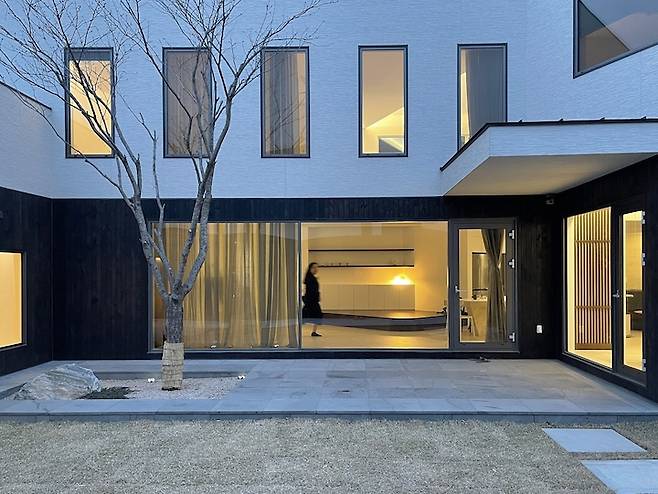 집 정면, 얼굴은 이렇게 생겼어요. 6미터가 되는 시원한 통창을 과감하게 배치하고 이층도 6개의 픽스 창으로 채광을 듬뿍 받을 수 있게 해 주었어요. 이건 좀 웃긴 얘기인데 (저만 재미있는 건가요 ㅎㅎㅎ) 건축가님께 "저는 햇볕에 타 죽어도 좋으니 빛이 아주 쏟아지게 창을 내주세요." 라고 부탁드렸어요. 그랬더니 정말 창 부잣집, 햇살 부잣집을 만들어 주셨어요. 제가 기억하기로 전체 창이 30개 쯤 되었던 걸로 기억해요.
