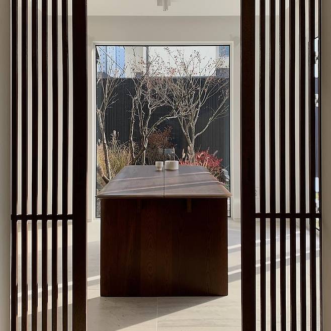 주방에서 남쪽으로 문이 하나 있어요. 간살문 도어 멋지지 않나요? 한옥같이 정갈하고 기품있으면서 심플한 디자인을 주기위해 간살문을 사용하였어요. 문을 닫아도 답답하지 않게 개방감 있게 파티션 역할 정도만 할 수 있을 정도로요. 다이닝룸은 짙은 브라운 색이 포인트입니다.