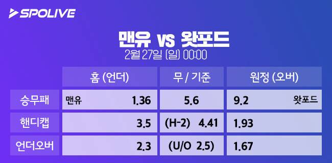 한편 이번 경기는 다득점 경기가 될 확률이 높다. 스포라이브는 양 팀 득점의 총합 2.5골 이하에 2.3배를, 2.5골 이상에는 1.67배의 배당을 책정했다. 최근 분위기가 매우 상반된 두팀의 만남이다. 왓포드전에 대한 설욕 의지가 강할 맨유의 3-1 승리가 예상된다.