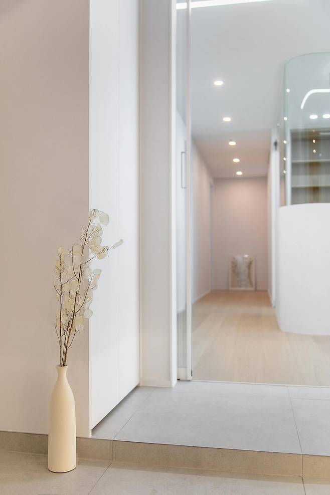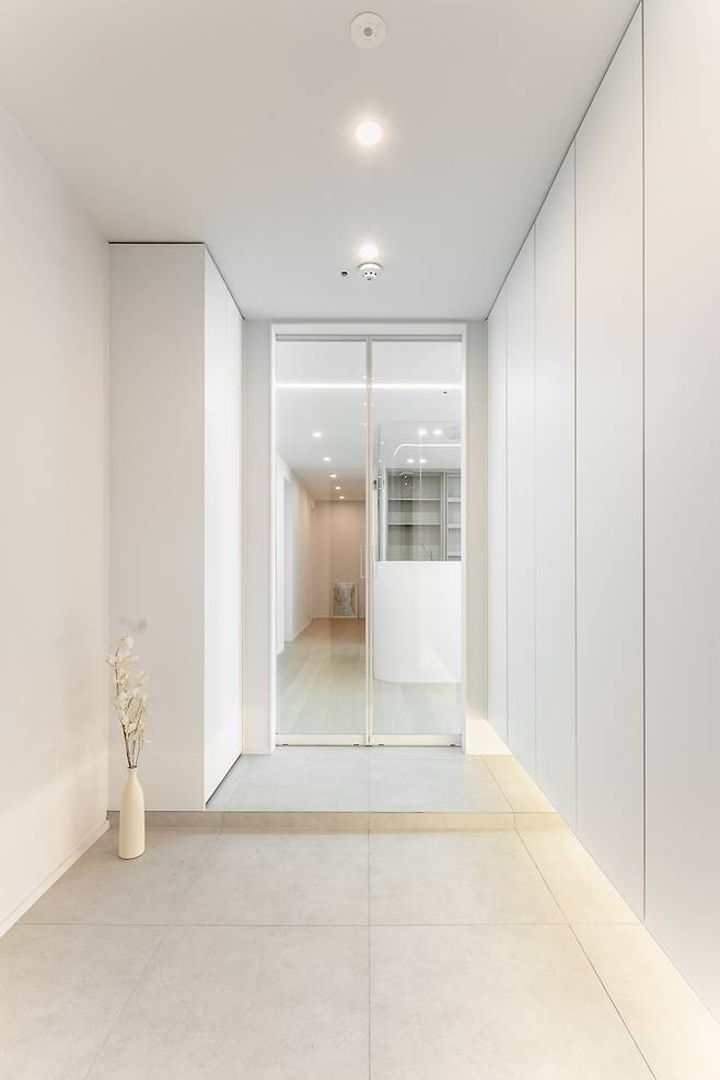 또한, 고객님의 자전거를 행잉 할 수 있는 공간을 확보하기 위하여 좌측 신발장을 간소화 하였습니다. 양문 슬라이딩 도어 중문은 슬림한 알루미늄 프레임을 사용하여 탁 트인 시야를 확보함과 동시에 양쪽 벽면으로 오픈하기 때문에 공간 활용도를 높일 수 있답니다.