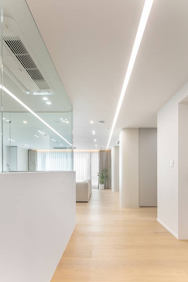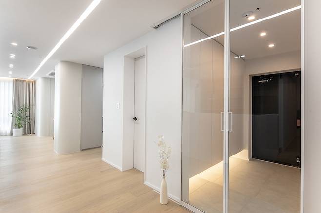 현관을 지나 집안으로 들어오면, 서재를 기준으로 두 개의 복도를 만날 수 있는데요. 그중 우측 거실 쪽으로 향하는 복도에는 라인조명을 설치하여 센스 있게 동선을 유도해 주었습니다.