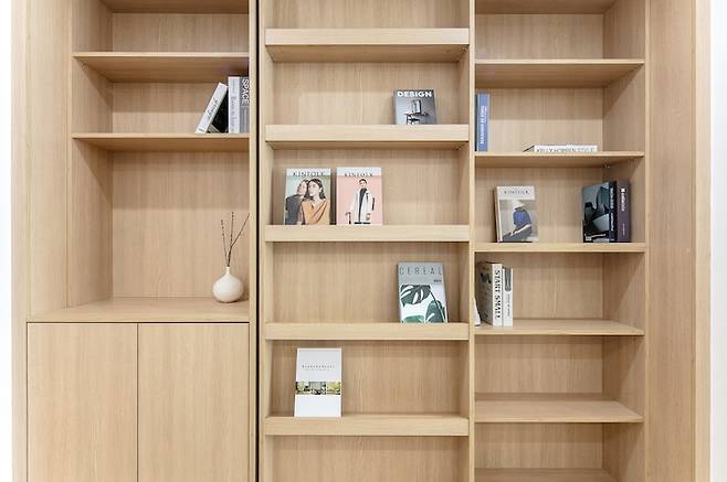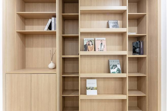 집의 전체적인 분위기를 이어주기 위해 서재 책장은 우드톤으로 제작했는데요, 역시 따뜻한 색감의 강마루와 잘 어울리네요~
