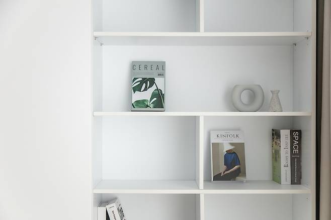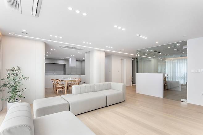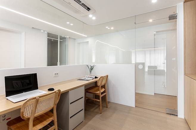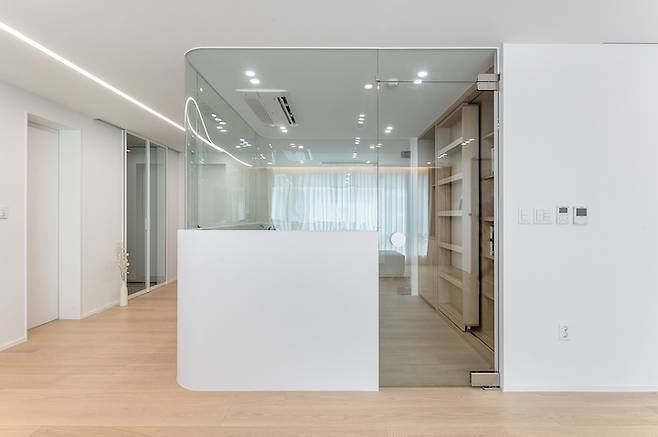 갑갑해 보일 수 있는 기존 가벽을 철거하고 가벽과 유리로 공간을 분리하면서 서재 안에서도 거실, 주방, 현관을 바라볼 수 있는 시야를 확보했습니다. 또한 양쪽에 설치된 도어를 열어두면 거실에서 바로 방으로 갈 수 있도록 실용성을 높여주었습니다.