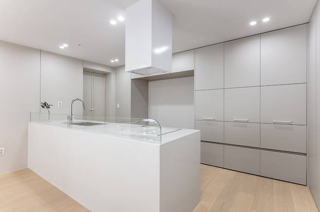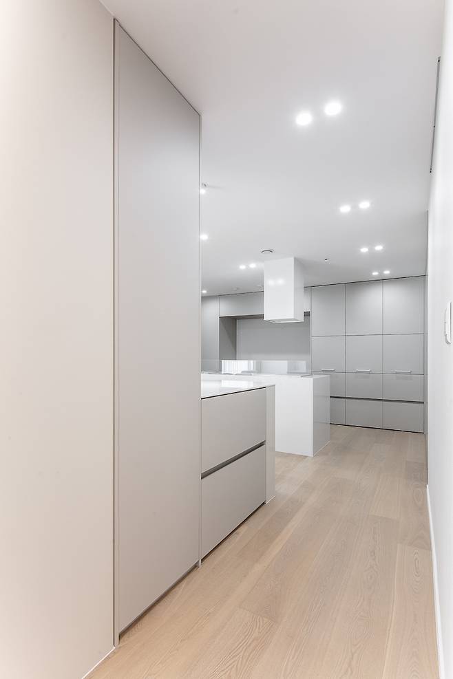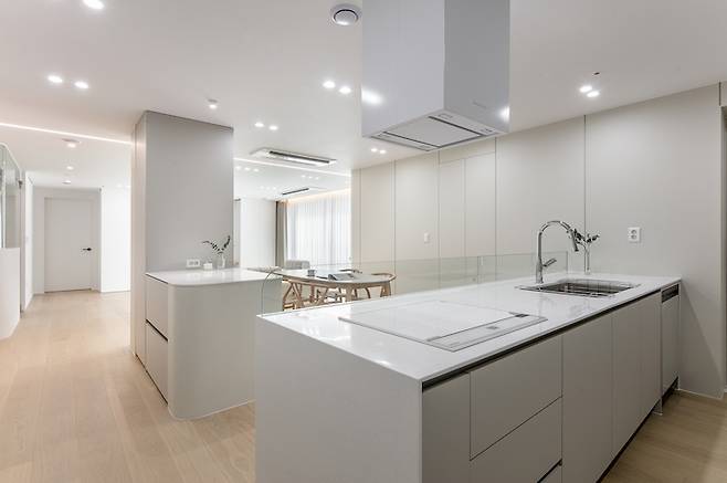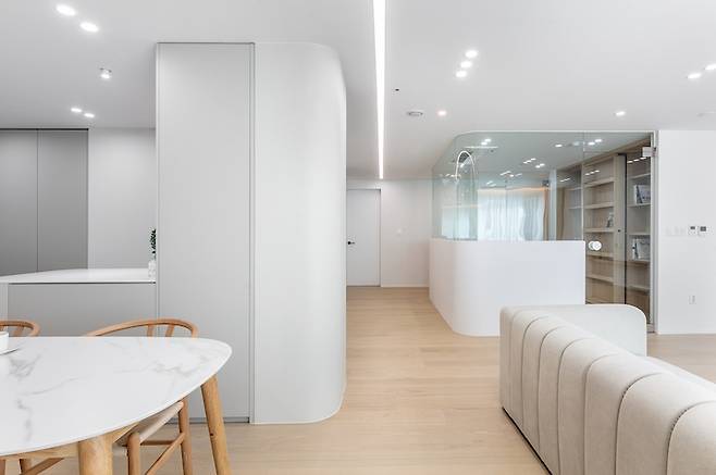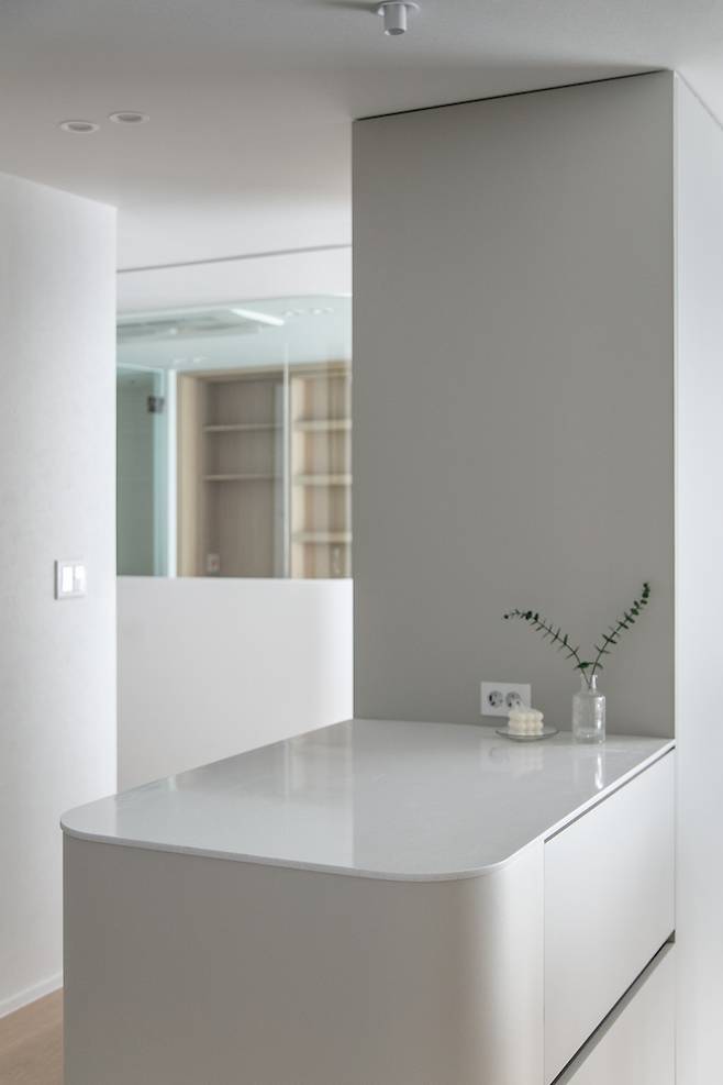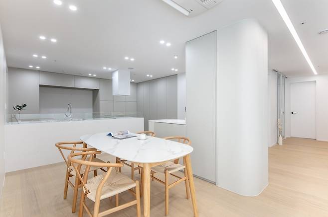 화이트 톤의 거실과 달리 주방은 차분한 웜 그레이 톤을 사용하여 무게감을 잡아주었습니다. 서재 벽면과 마찬가지로 주방의 벽면들은 곡선으로 마감하여 부드러운 이미지를 선사하도록 했어요.
