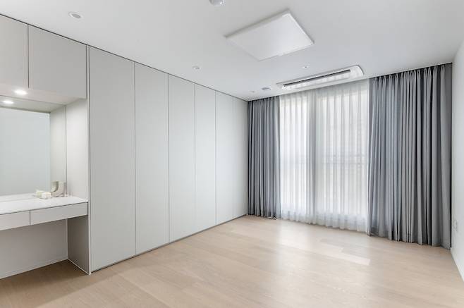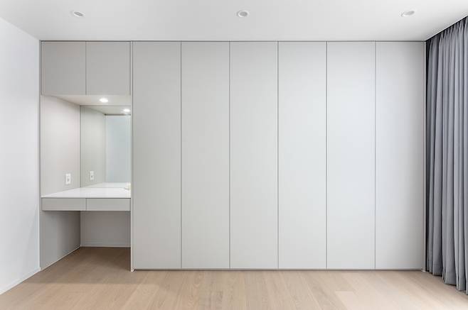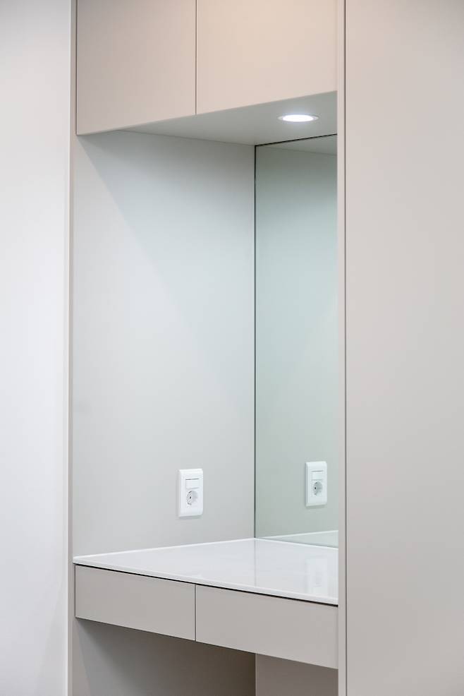 기존의 편백나무 침대를 사용하고 싶어 하신 사용자에 맞게 한쪽 벽면에 붙박이장과 화장대를 배치하여 군더더기 없이 깔끔한 느낌을 자아냅니다.
