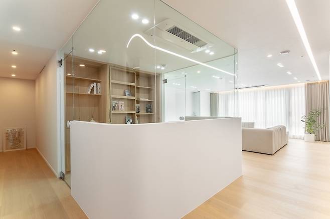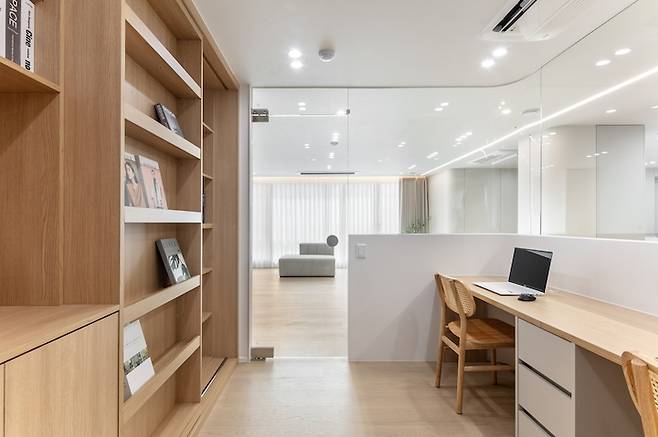 이 집의 포인트 공간인 서재는 맞벌이하는 부부가 책을 읽거나 작업할 수 있는 공간으로 활용할 수 있습니다. 어린아이들도 함께 사용할 수 있도록 낮은 높이의 가벽을 세우고 상부 라운드 유리를 두어 답답해 보이지 않도록 공간을 계획했습니다. 하단의 가벽은 책상 높이보다 높게 계획하여 파티션 역할을 해주어 업무의 집중도를 상승시킵니다.