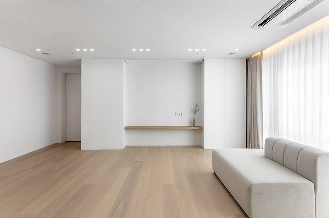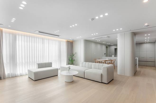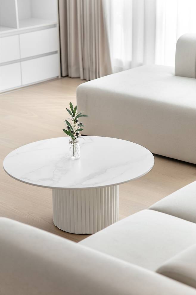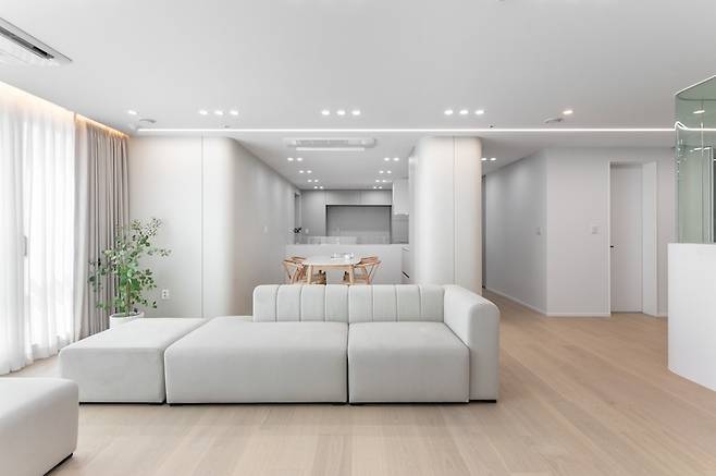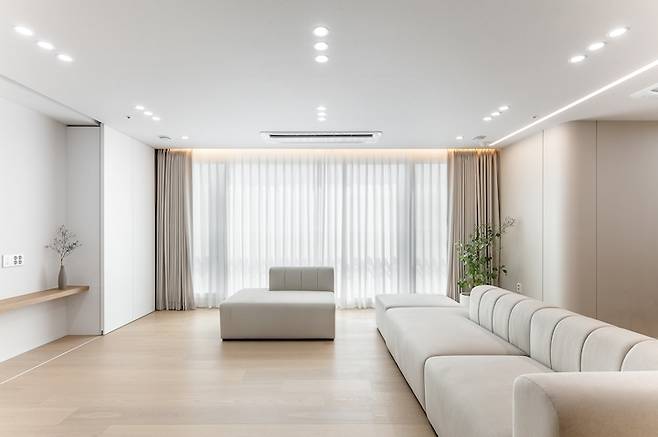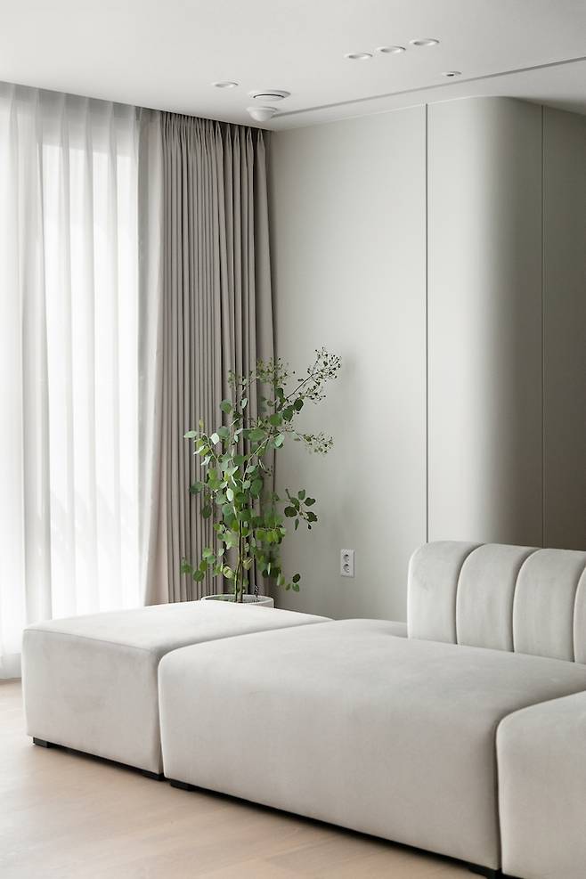 화이트톤과 어울리는 크림색의 모듈 소파는 배치를 자유롭게 변형하여 사용할 수 있어 공간을 다양하게 활용할 수 있으며 등받이가 낮아 창문을 등지고 배치할 경우에도 답답함이 없습니다.
