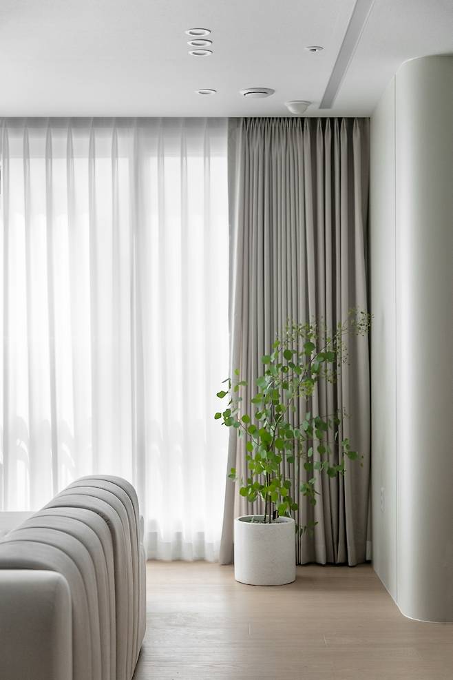 라운드 벽면으로 이루어진 주거 인테리어는 흔하지 않아서인지 더욱 새롭고 흥미롭게 느껴지는 것 같습니다. 공간은 그 공간을 사용하는 사용자의 기분도 좌우할 수 있는 파워를 가지고 있죠. 저희 프로젝트 디자이너는 고객님의 생활을 리프레시 시켜주는 집이 되길 바라며, 인테리어 콘셉트에 맞게 가구 또한 스타일링을 도와드렸는데요, 그래서인지 한층 더 감성 깊고 러블리한 공간이 완성되었습니다 :)