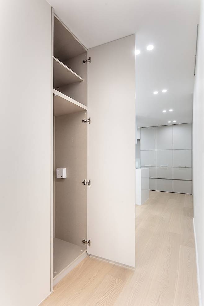 철거할 수 없는 기둥을 라운드 마감으로 감싸고 수납장을 함께 배치하여 청소도구를 수납할 수 있는 공간을 만들었습니다.