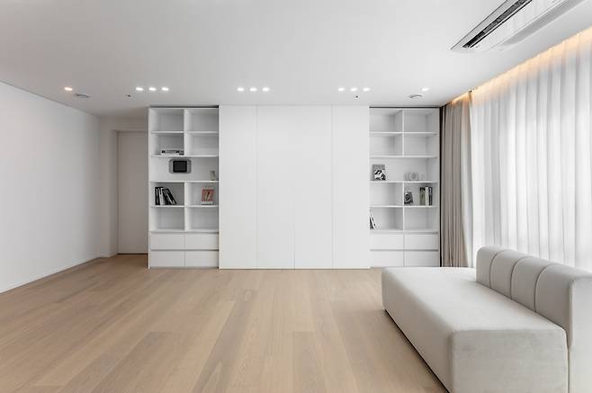 언뜻 보기에는 평범한 수납장같이 보이는 비밀 아트월! 그러나 양쪽의 슬라이드 도어를 TV 쪽으로 밀어보면 책장과 수납공간이 나타납니다.