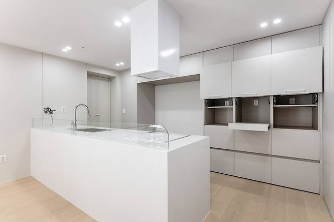 또한 가전제품을 모두 안 보이는 곳에 수납하길 원하신 고객님의 니즈 또한 수렴하여 터치 도어와 리프트 도어들로 수납을 구분하여 편리성을 더했답니다.