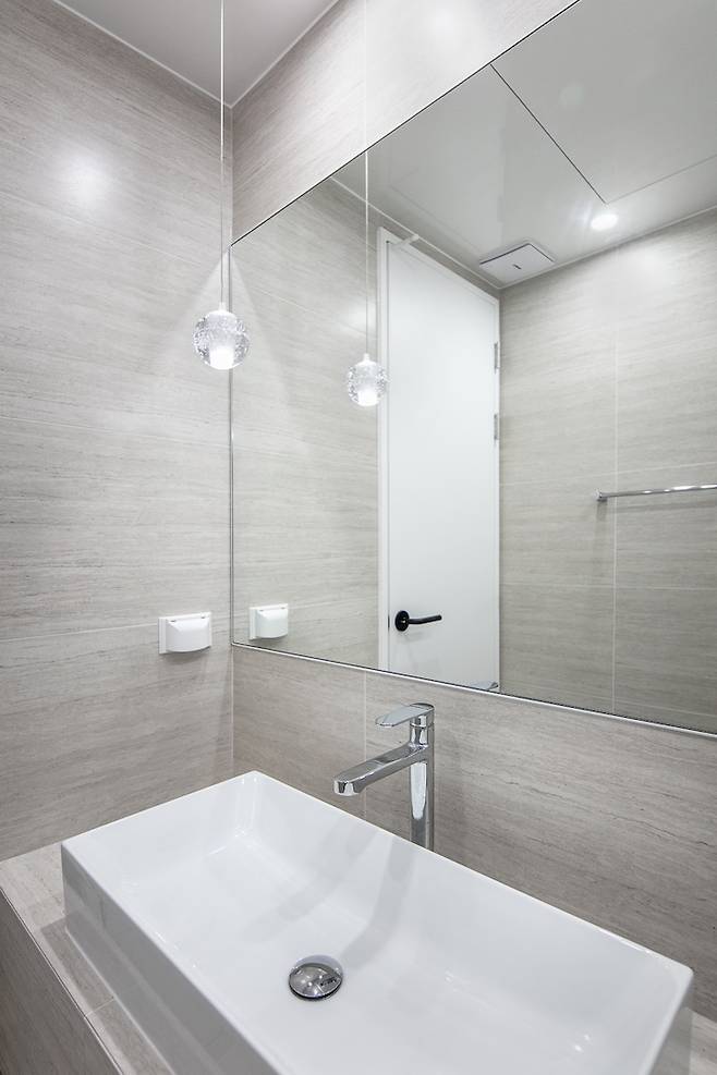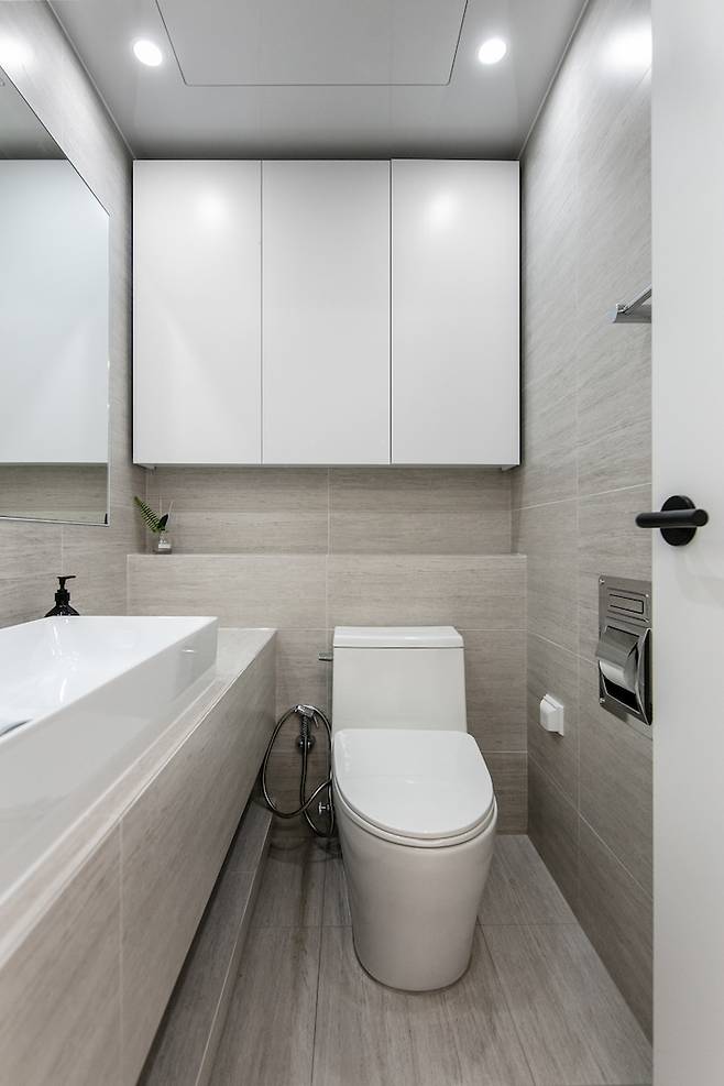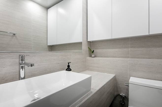 밝은 색의 가로결 타일을 사용하여 바닥, 벽 전체에 시공하여 좁아 보이지 않도록 디자인하였습니다. 타일로 세면대 하부에 선반을 제작하여 수납공간을 더했습니다.