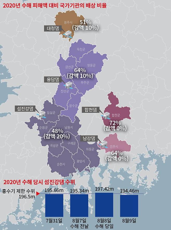 중조위는 왜 형평성 논란을 일으킬 조정 결과를 발표했을까. 앞서 말한 3월22일 환경부 보도자료에 이를 설명하는 내용이 나온다. 당초 5개 댐의 배상 비율은 모두 60~69.3%로 큰 차이가 없었다. 그런데 ‘감액 요소’가 있었다. 수해 당시 비가 많이 내린 지역은 액수를 깎았다. 그 결과 섬진강댐이 20%, 용담댐이 10% 감액당했다. 자연재해가 심각할수록 배상액을 줄이는 이상한 선례가 만들어진 셈이다. 섬진강댐의 홍수 조절 능력이 ‘100년 빈도(100년에 한 번 내리는 큰 비에 견딜 수 있다는 뜻)’로 200년 빈도인 다른 댐에 비해 취약하다는 점은 고려되지 않았다.