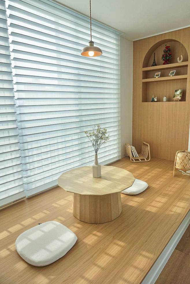이곳은 밤낮으로 저희 부부에게 안식처가 되어주고 있습니다. 낮에는 햇살이 내리쬐는 평화로운 다도실로, 밤에는 빔 프로젝터를 이용한 와인바로 변신해 주곤 한답니다. 남편은 종종 보고 싶어 하던 SF 영화를 이곳에서 혼자 맘껏 보곤 해요.
