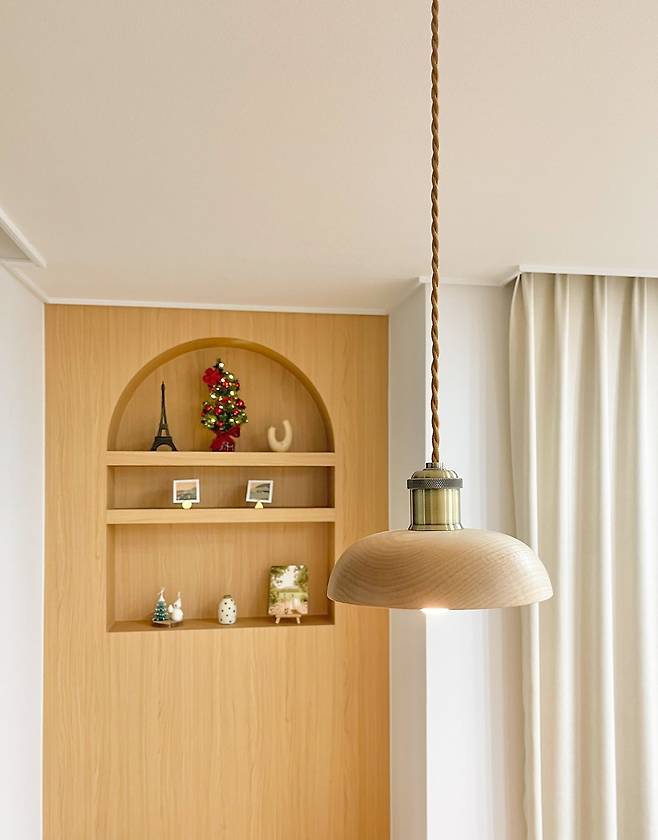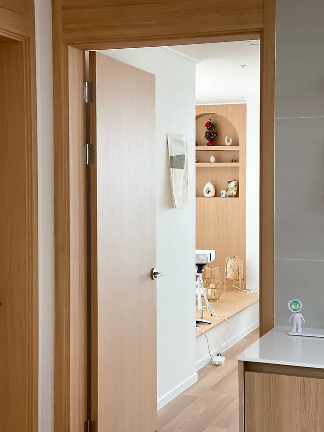 먼저 빈 벽면에는 빌트인 선반을 달아 주었어요. 제가 좋아하는 우드 컬러 베이스에 아기자기한 소품으로 따뜻한 감성을 더했습니다.