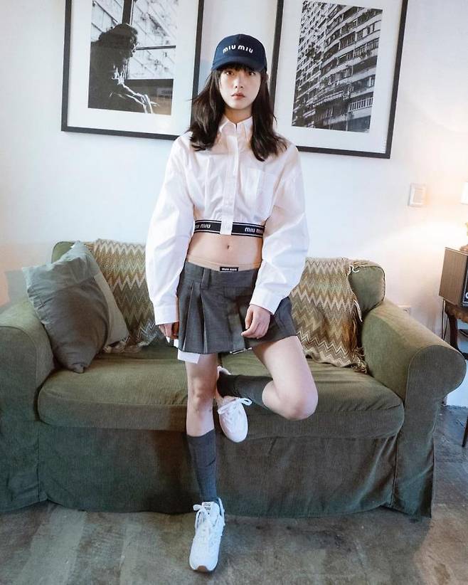 〈오징어 게임〉, 〈지금 우리 학교는〉으로 넷플릭스 공무원 자리를 노리고 있는 '미우미우걸' 이유미! 이유미 또한 미우미우 제품으로 로우웨이스트 스타일을 선보였다. 로고 볼캡과 스니커즈를 더해 캐주얼하면서 러블리함을 더한 룩을 완성했다.