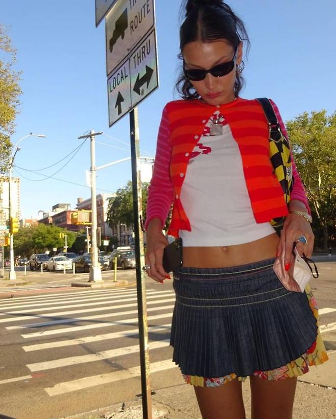 이 구역 로우웨이스트 잘알러 벨라 하디드. 로우웨이스트의 유행이 시작되기 전부터 벨라는 로우웨이스트에 그 누구보다 진심이였다! 비비드한 크롭가디건과 미니 스커트로 Y2K & 로우웨이스트 무드를 완벽하게 선보이는 중. 벨라의 손에 들린 마스크만 없었다면 모두들 X세대의 그 시절 사진이라고 깜빡 속았을지도 모르겠다!