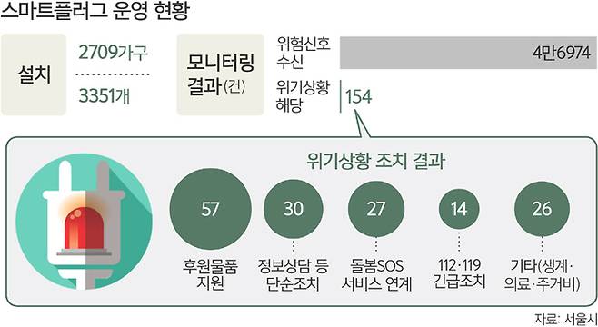 서울시에 따르면 약 1년4개월간 스마트플러그를 통해 총 4만6974건의 신호가 전송됐다. 이 중 실제로 위험 상황으로 판단돼 조치가 이뤄진 사례는 154건이었다. 알코올 중독으로 건강상태가 안 좋거나 거동이 불편해 혼자 식사나 이동이 어려운 상황 등이 대부분이었다. 시는 112·119 긴급조치, 돌봄SOS서비스 연계, 긴급복지(생계비·의료비·주거비) 지원 등을 통해 대상자별 사후관리를 지속하고 있다.