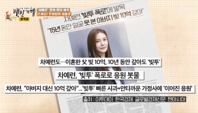 배우 차예련이 과거 아버지의 부도와 사기사건으로 홀로 10억원이 넘는 돈을 갚았던 일을 떠올리며, 결혼을 서둘렀던 이유를 털어놨다.
