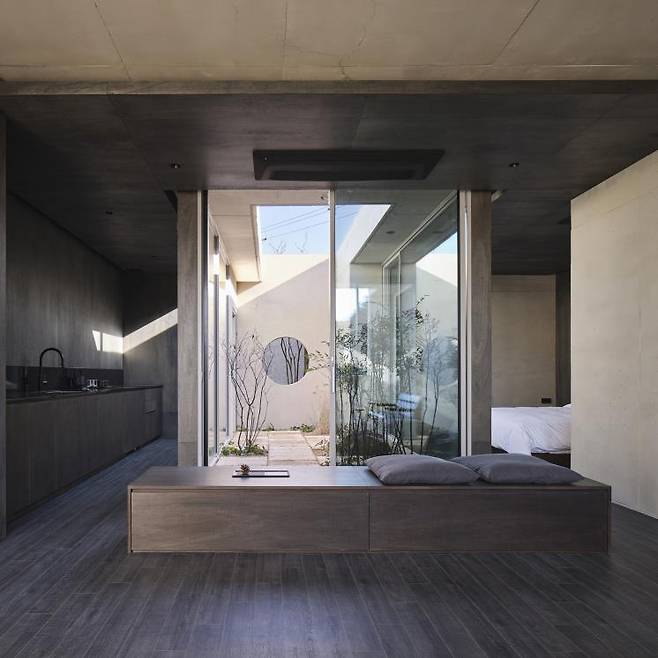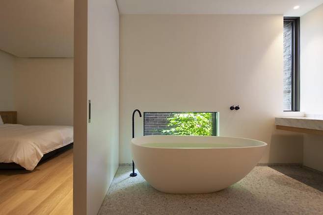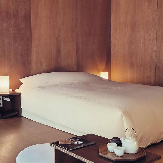 자연 그대로만 둬도 예쁜 춘천의 숲 속, 심플한 선과 면으로 이루어진 ‘나그네의 집’ 의림여관. 객실은 우실, 좌실로 나눠져 있고 이용 가능한 인원은 최대 2인이다. 한 객실 안에서 모든 게 가능한 독채 숙소이기 때문에 방에 콕 틀어박혀 좋아하는 드라마나 영화, 노래를 즐기며 힐링을 만끽할 수 있다. 침실과 분리된 욕조, 다이닝 공간, 침실 등 어둑해 보이지만 간접 조명과 커다란 창이 시원하게 나있어 햇살을 원없이 즐길 수 있다는 점도 장점이다.