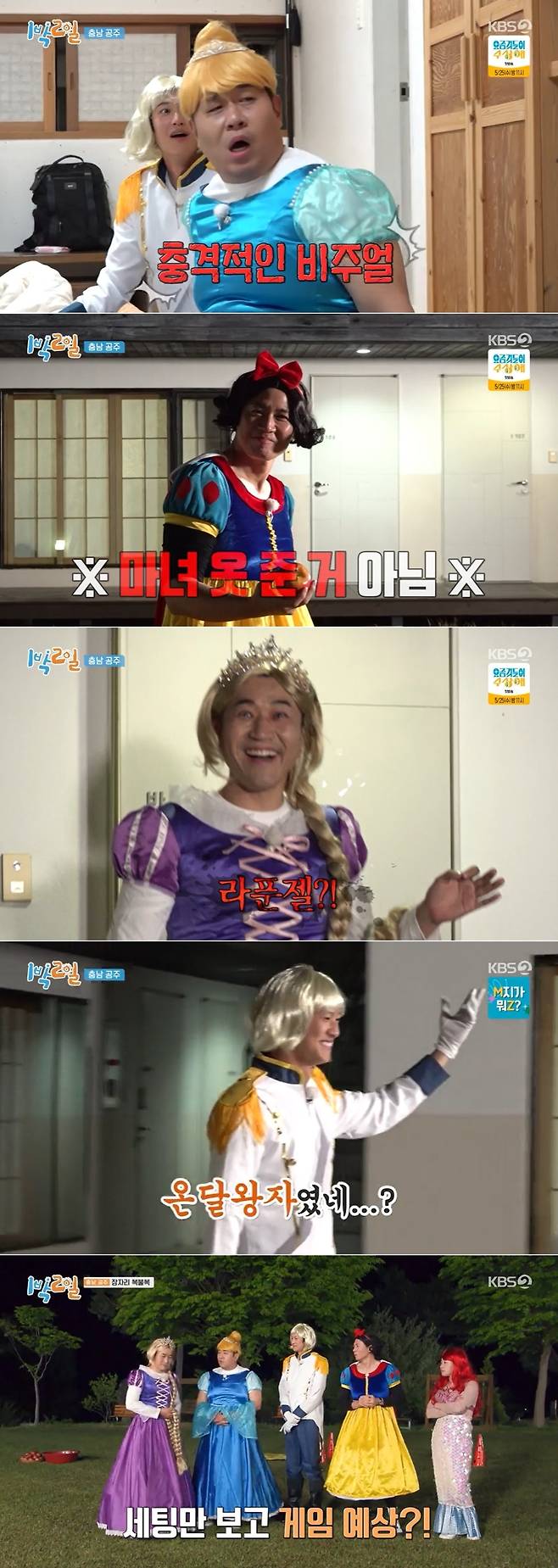 5월 15일 방송된 KBS 2TV '1박2일 시즌4'는 충남 공주 특집으로 꾸며졌다. 이에 제작진은 멤버들을 위해 다양한 만화 속 공주 의상을 준비했다.