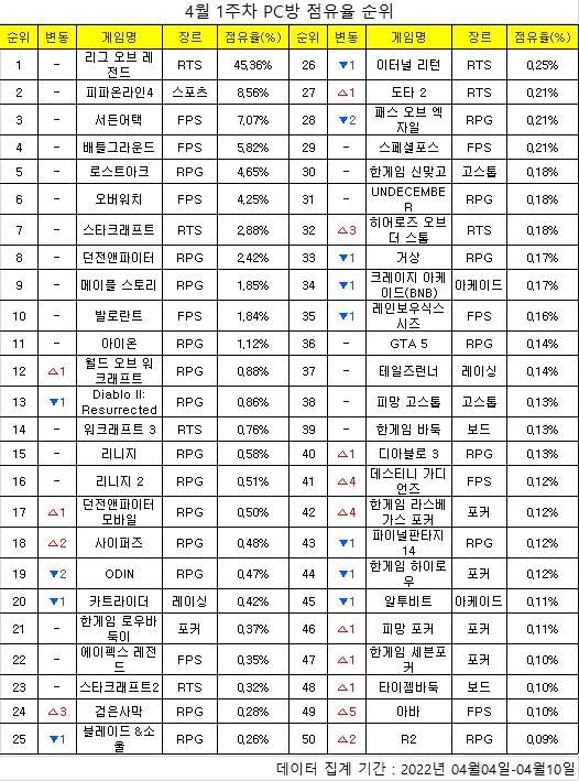 한 주간의 PC방 순위를 되짚어 보고, 어떤 변화가 있었는지 알아보는 'PC방순위' 코너입니다. 데일리게임은 매주 PC방 순위를 일목요연하게 정리, 독자들이 알아보기 쉽도록 제공합니다. 지난 한 주간 어떤 PC 온라인게임들이 눈길을 끌었는지 살펴봤습니다. < 편집자주 >