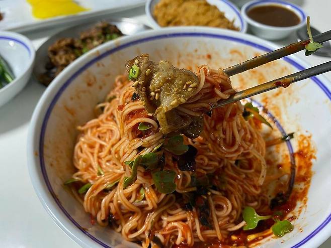 [식신TIP] 비빔국수에 불고기 추가해도 고작 8,500이니까 무조건 불고기 추가해야죠~ 야들야들 달달한 석쇠불고기에 맵지 않아 더 맛있는 비빔국수 조합이라니 완전 꿀맛~