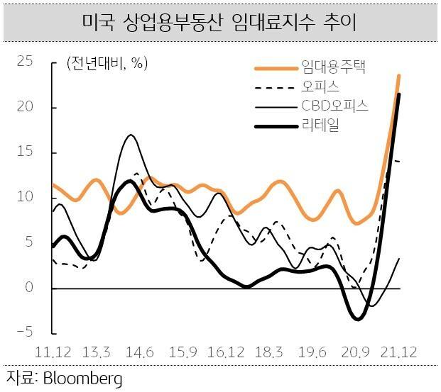 2021년 하반기 이후 상업용부동산 임대료지수는 빠른 상승세를 보이고 있으며, 도심 외곽지역의 오피스와 임대주택 및 리테일을 중심으로 크게 상승했습니다. RCA에 따르면 거래시장 호황에 힘입어 미국 상업용부동산지수는 18.4% 상승했습니다.