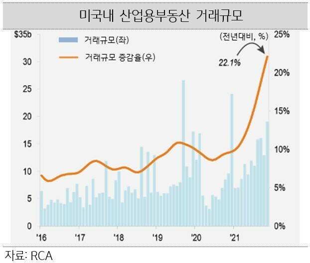 부동산 정보업체 RCA에 따르면 미국내 상업용부동산 투자총액은 8,090억달러로 전년 대비 2배 증가했고, 2019년 6,000억달러 수준을 넘어선 것으로 조사됐습니다. 특히 산업용부동산 (물류센터, 데이터센터 등)은 전년 대비 22.1%, 임대주택은 19.2% 증가했습니다.
