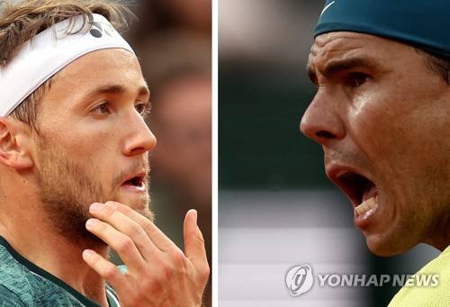 epa09995859 A combo pictures shows Rafael Nadal of Spain (R) and Casper Ruud of Norway during their matches at the French Open tennis tournament at Roland ?Garros in Paris, France, issued on 04 June 2022. Nadal and Ruud will play in the final of the Men's Singles of the French Open in Paris on 05 June 2022. EPA/MARTIN DIVISEK / YOAN VALAT