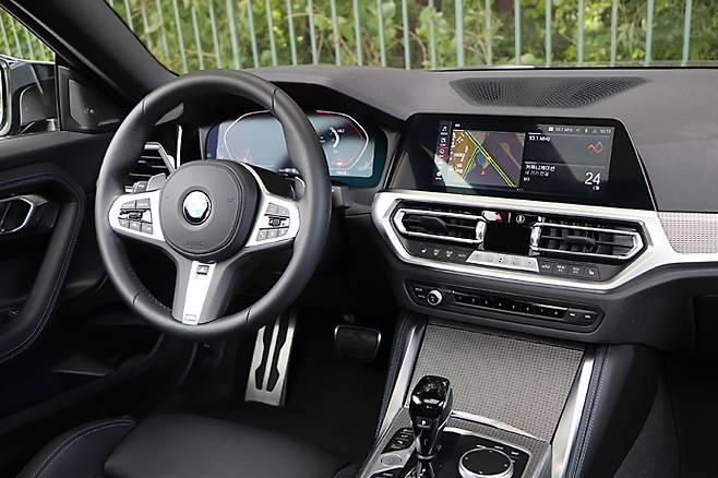 측면에서는 BMW 쿠페의 전형적인 차체 비율과 앞쪽의 샤크 노즈, 차체 실루엣과 조화를 이루는 콕핏의 비율 등이 포인트다. 당연히 파란색 M 스포츠 브레이크가 적용된 19인치 더블 스포크 휠이 채용되어 있다.