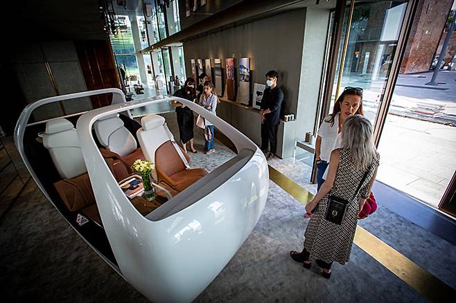먼저 ‘친환경 모빌리티 컨셉 시트’는 지속가능한 가죽과 가공방법, 재생가죽을 적용한 미래 자율주행 컨셉 모델로 전시장 중앙에 위치한다.