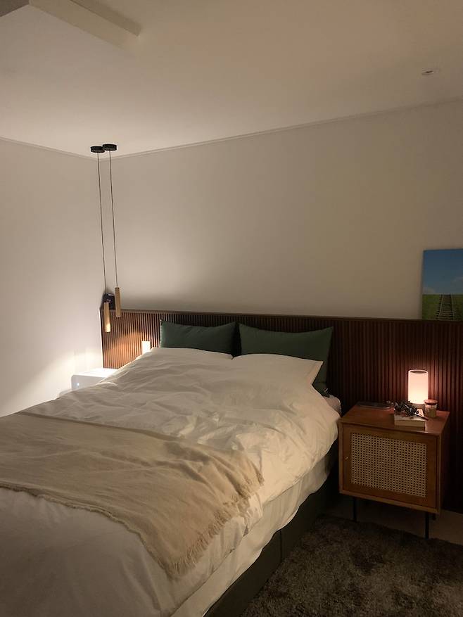 침대 옆 펜던트 조명은 예전부터 너무 갖고싶던 제품이라 침대 머리맡에 설치했어요. 헤드쪽으로 스위치까지 신설해 주니 침대에 누운 상태로 자기 전에 등을 끌 수 있는 디테일이 더욱 호텔같아요.