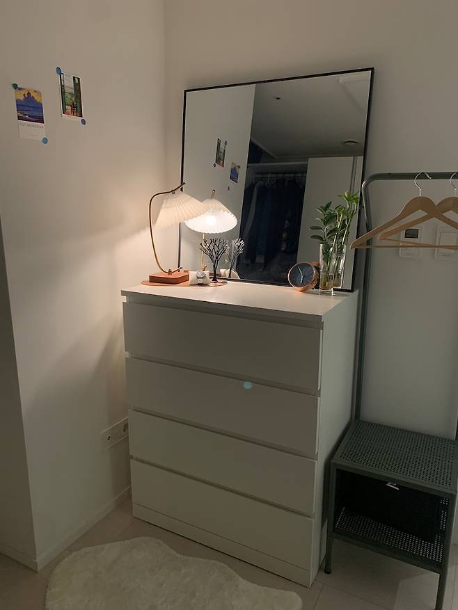 한쪽 벽에는 화장대겸 수납장과 거울을 두었습니다. 물건이 많이 나와 있는 걸 싫어해서 수납장 맨 위 칸에 화장품과 악세서리를 넣어두고 있어요. 코너장에도 전신거울이 있지만, 수납장 위를 화장대처럼 쓰기 때문에 큰 거울을 추가로 올려두고 시원시원하게 쓰고 있습니다.