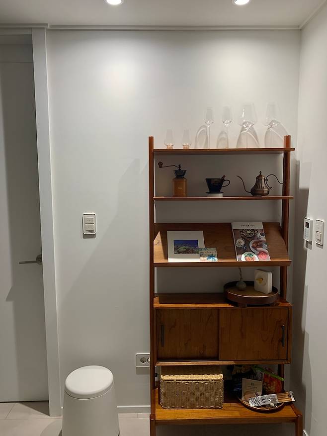 싱크대 뒤에 놓은 장식장에는 와인잔과 커피용품 등을 올려두고 있어요. 열린 장식장은 공간을 더 개방적으로 만들어주는 장점이 있죠. 평소 사용하는 제품 중 예쁜 것 위주로 올려두니 장식 겸 수납이 가능해지더라구요. tip으로 수납장 맨 밑 라탄바구니 안에는 인터넷 공유기와 스마트스피커를 숨겨두었습니다. 드러내고 싶지 않은 물건들은 이렇게 라탄바구니에 숨겨두면 보기도 예쁘고 작동도 잘 되더라구요.