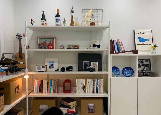 서재는 책과 함께 잡동사니를 수납하는 곳이기도 한데요, 막혀있는 수납장은 답답한 느낌이 들어서 하나만 구입하고 오픈형의 장식장을 주로 사용하고 있어요. 잡다한 물건들은 라탄바구니나 수납박스에 담아서 선반장에 올려두었더니 수납장의 역할도 잘 해내고 있습니다. 박스 앞에는 내용물과 관련된 저희 사진을 붙여서 물건도 찾기 쉽고 유니크한 느낌을 주도록 해보았어요.