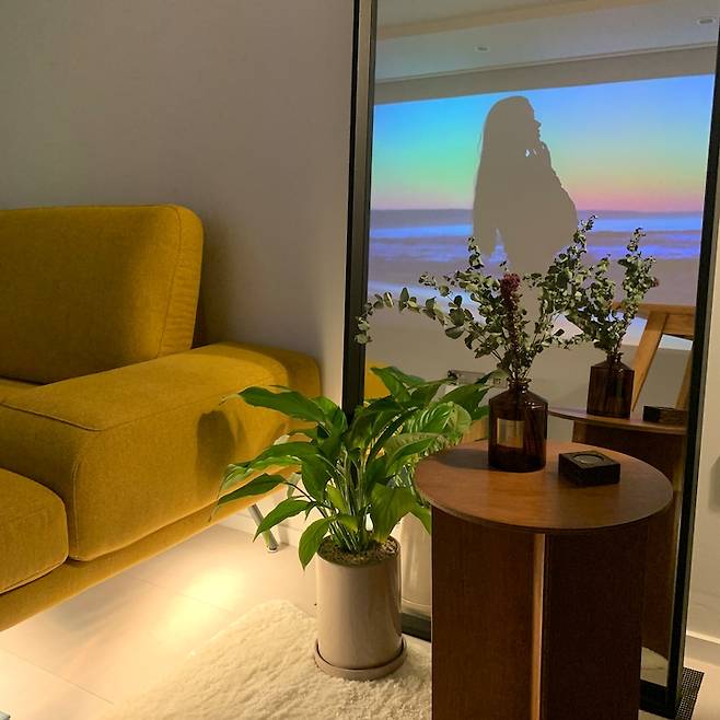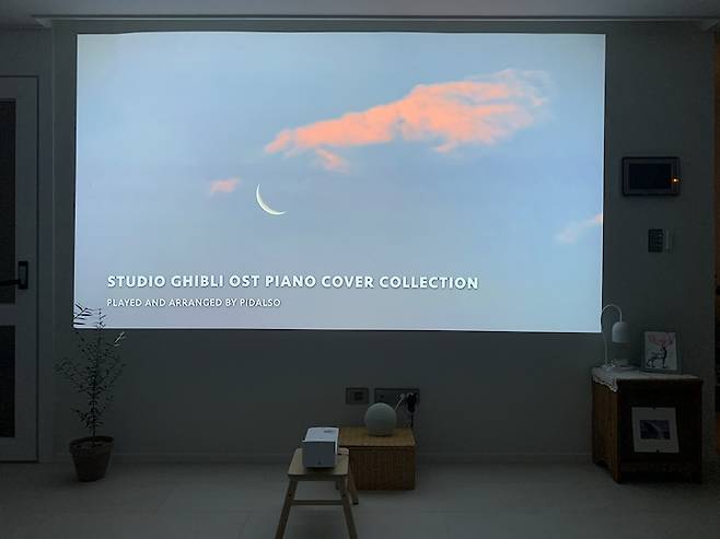 기존에 아트월이 있던 거실 벽은, 빔프로젝터를 위해 아트월을 철거하고 나무판을 대서 깨끗하게 도배했어요. 암막 커튼을 치면 스크린 없이 흰 벽에만 쏴도 충분히 선명하답니다. 초단초점 빔프로젝터를 샀는데 이동이 자유롭고 벽 바로 앞에 놓아도 영화관처럼 큰 화면을 즐길 수 있어서, 안방과 거실을 옮겨다니며 잘 쓰고 있어요. 꼭 영화를 볼 때가 아니더라도 유튜브 음악만 틀어놔도 집안 분위기가 힙해지는 것도 포인트에요.