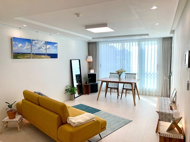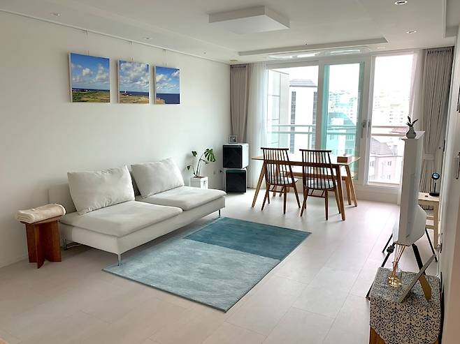 최근 소파를 바꾸고 난 뒤의 모습이에요. 비비드한 컬러의 소파에 도전해 봤는데, 걱정과 다르게 화이트 톤의 배경과 우드 가구에 정말 잘 어울리더라구요. 소파 쪽 벽에 걸린 사진은 남편이 여행가서 직접 찍은 사진입니다. 추억이 깃든 사진인 만큼 거실이 많이 바뀌어도 사진만큼은 거실을 지키고 있어요.