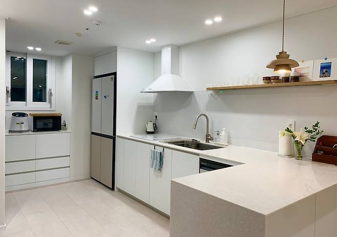주방에서 보면 이렇게 거실과 이어지는 느낌을 줘요. 그래서인지 다들 집이 더 넓어 보인다는 말씀을 하시네요. 요리하는 걸 좋아하는데 조리공간도 넓어지고 손님이 왔을 때도 마주보고 얘기하며 요리할 수 있어서 좋습니다.