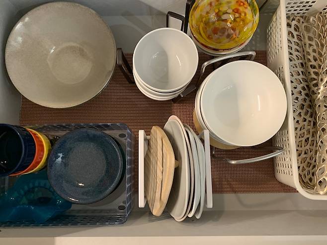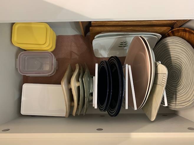 저희 하부장은 서랍 구성이 많은데요, 이렇게 하니 물건 꺼낼 때 쪼그려 앉지 않아도 되는 장점이 있어요. 사진처럼 그릇을 세워서 정리해 두니 수납장 안쪽까지 한눈에 보이고 하나씩 꺼내기 편하답니다.