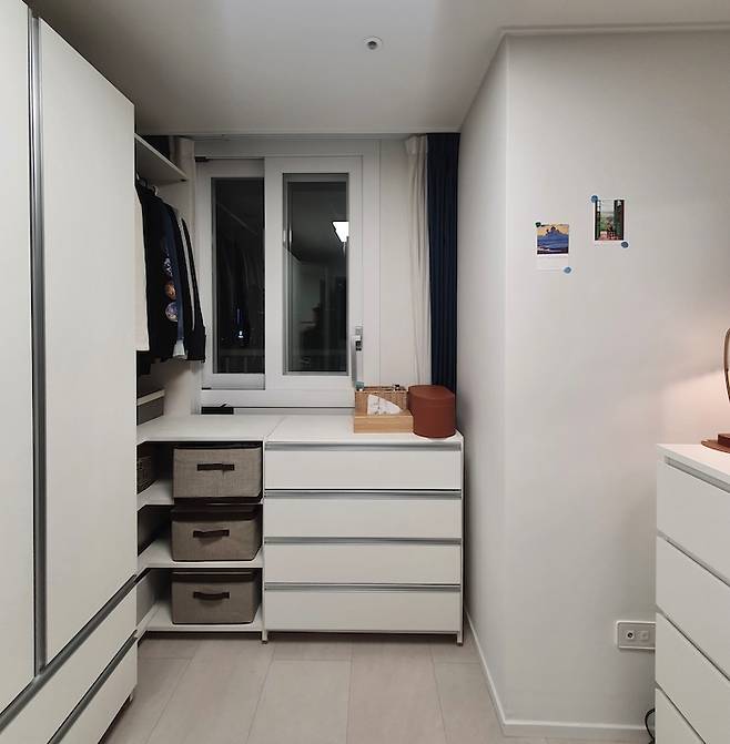 드레스룸은 옷과 화장품이 모두 모여 있는 공간입니다. 붙박이장을 맞추려다가, 창문을 가리지 않으며 구성할 수 있는 수쿠퍼니텍을 알게 돼서 설치했습니다. 조립식이고 옷장 뒷판이 없어서 공간을 덜 차지하는 면도 큰 장점이 되네요. 옷은 예쁘게 수납할 자신이 없어서 문을 달아주고 오픈형 장에는 패브릭 박스에 옷과 악세서리를 추가로 보관하고 있어요.