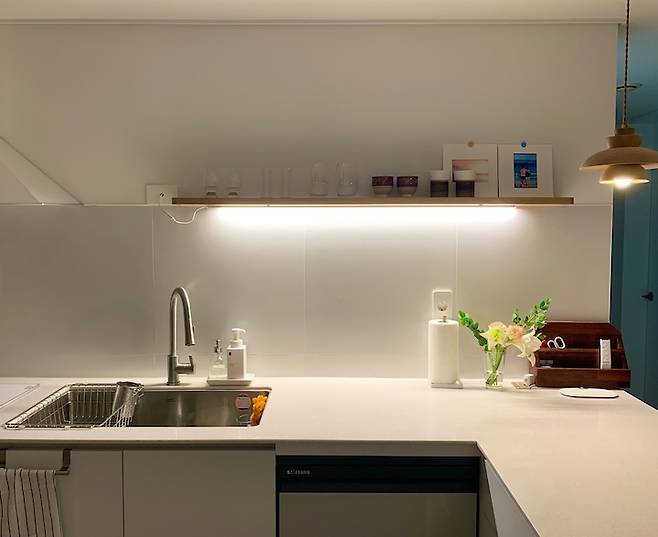 원목 무지주 선반에는 자주 쓰는 컵을 올려두고 좋아하는 사진으로 장식했습니다. 선반 아래는 센서로 on/off할 수 있는 조명도 설치했어요. 손 대지 않고 켤 수 있어서 요리나 설거지 시에도 편하게 사용할 수 있고, 잠시 싱크대 쓸 때 전구색 조명만 살짝 켤 수 있어서 좋아요.