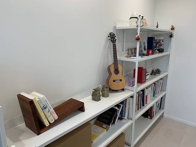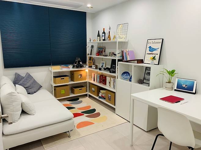 현관 가까운 큰 방은 서재 겸 남편의 재택근무를 위한 방입니다. 원래는 위 사진처럼 장식장을 ㅡ자로 배치했는데, 새 소파를 사면서 기존 소파가 서재로 들어와 현재는 ㄱ자모양으로 놓고 있어요. 방에 소파를 들였더니 책을 집어서 바로 소파에 앉을 수도 있고, 재택근무를 하며 잠시 쉬는 공간이 되어주기도 하네요.