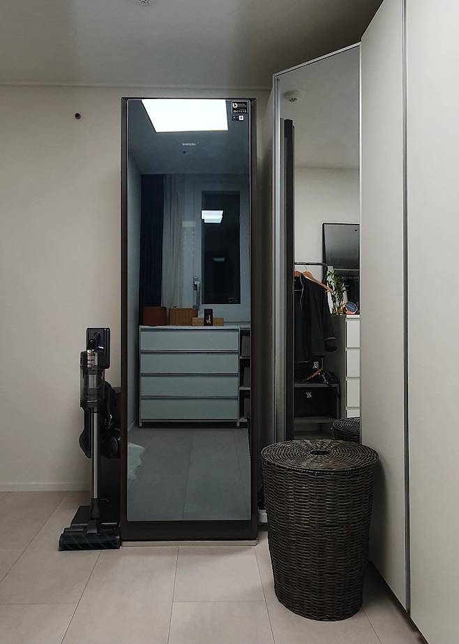 오른쪽 코너 장은 내부가 굉장히 넓어요. 앞에 전신거울도 유용하고 안쪽에는 겨울 이불, 패딩 등 모두 들어갈 수 있는 저희집 수납 필수 제품입니다. 옷장 옆에는 구입을 망설였던 에어드레서가 있어요. 막상 사용해 보니 외투는 물론이고 베개나 이불솜 등 빨기 어려운 제품을 살균하는 데에도 활용이 많이 되더라구요. 이왕 에어드레서를 사신다면 큰 사이즈로 써보시는 걸 추천합니다.