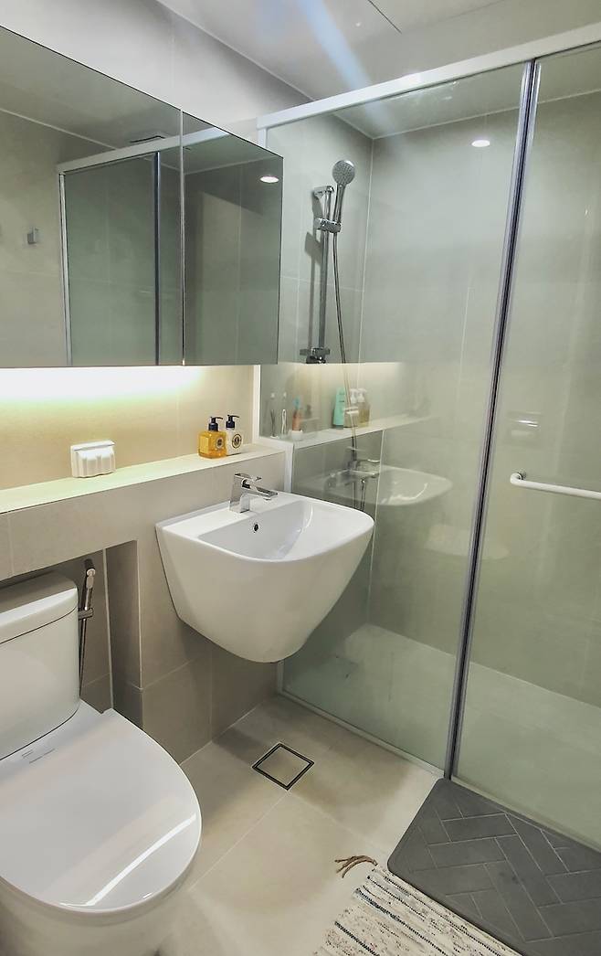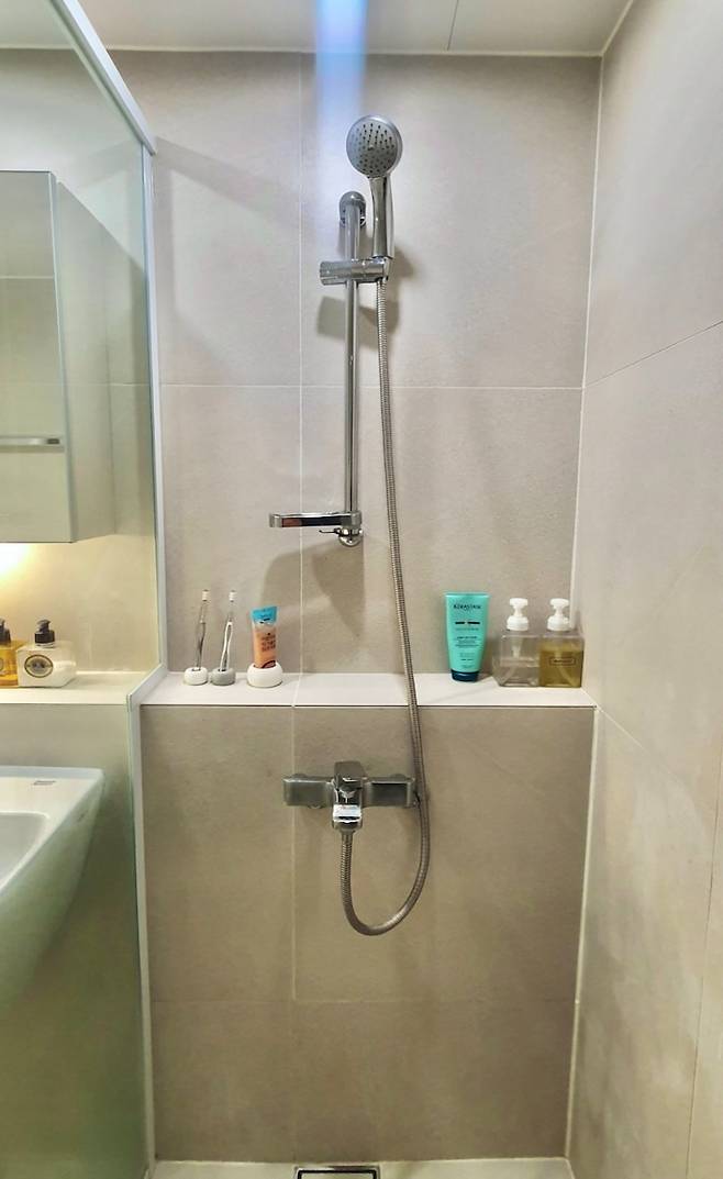 기존에 욕조가 있었는데 생활패턴을 고려해서 철거 후 샤워부스를 설치했습니다. 조적벽도 생각했지만 화장실이 넓지 않은 편이라 유리부스로만 시공했습니다. 젠다이를 샤워실까지 연장하니 코너 선반 없이 깔끔하게 유지되고, 장식품도 올려놓을 수 있어서 정말 실용적인 것 같아요.