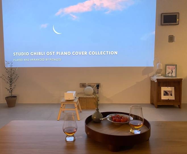 기존에 아트월이 있던 거실 벽은, 빔프로젝터를 위해 아트월을 철거하고 나무판을 대서 깨끗하게 도배했어요. 암막 커튼을 치면 스크린 없이 흰 벽에만 쏴도 충분히 선명하답니다. 초단초점 빔프로젝터를 샀는데 이동이 자유롭고 벽 바로 앞에 놓아도 영화관처럼 큰 화면을 즐길 수 있어서, 안방과 거실을 옮겨다니며 잘 쓰고 있어요. 꼭 영화를 볼 때가 아니더라도 유튜브 음악만 틀어놔도 집안 분위기가 힙해지는 것도 포인트에요.
