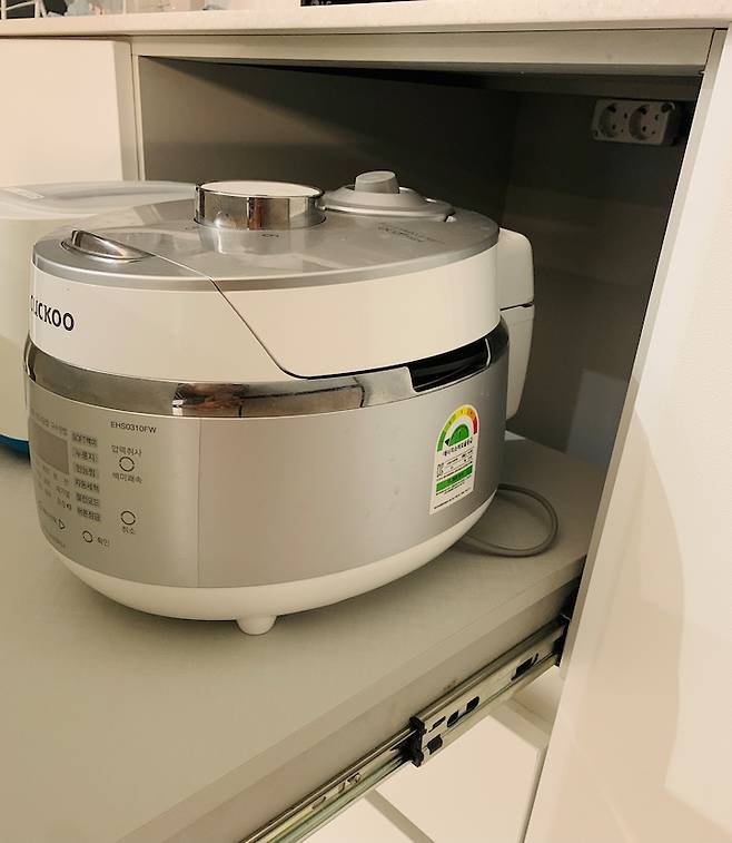 부엌에 밥솥이 어딨나 찾으셨을 텐데요, 전자렌지 아래 칸에 밥솥과 토스터를 넣고 쓰고 있습니다. 밥을 한 번에 많이 해서 냉동실에 두고 먹는 편이라 밥솥이 매번 나와있을 필요가 없더라구요. 안쪽으로 멀티탭도 붙여놓아서 밥솥을 꺼내지 않고 하부장을 살짝 열어놓은 상태에서 취사할 수 있습니다.
